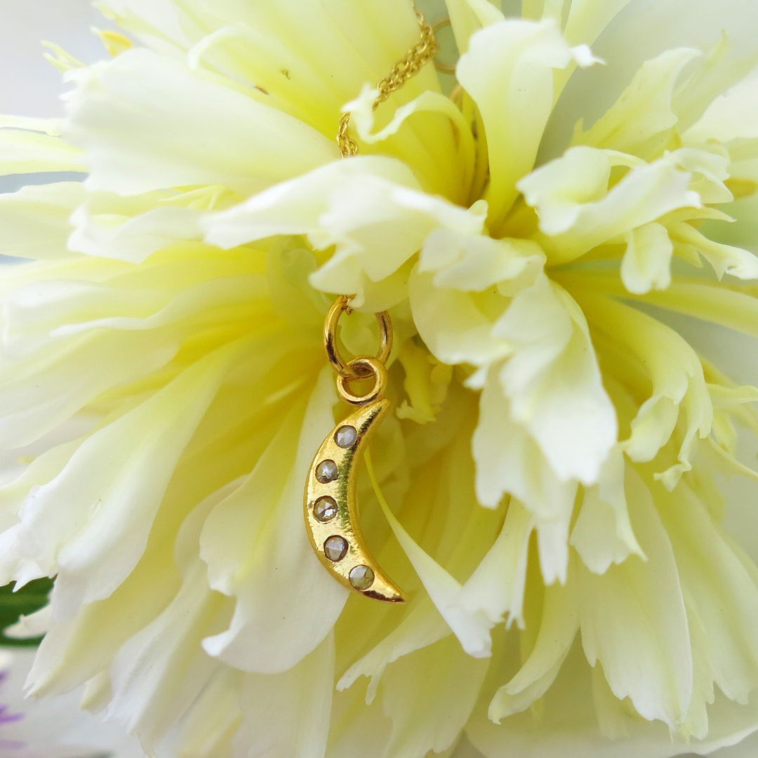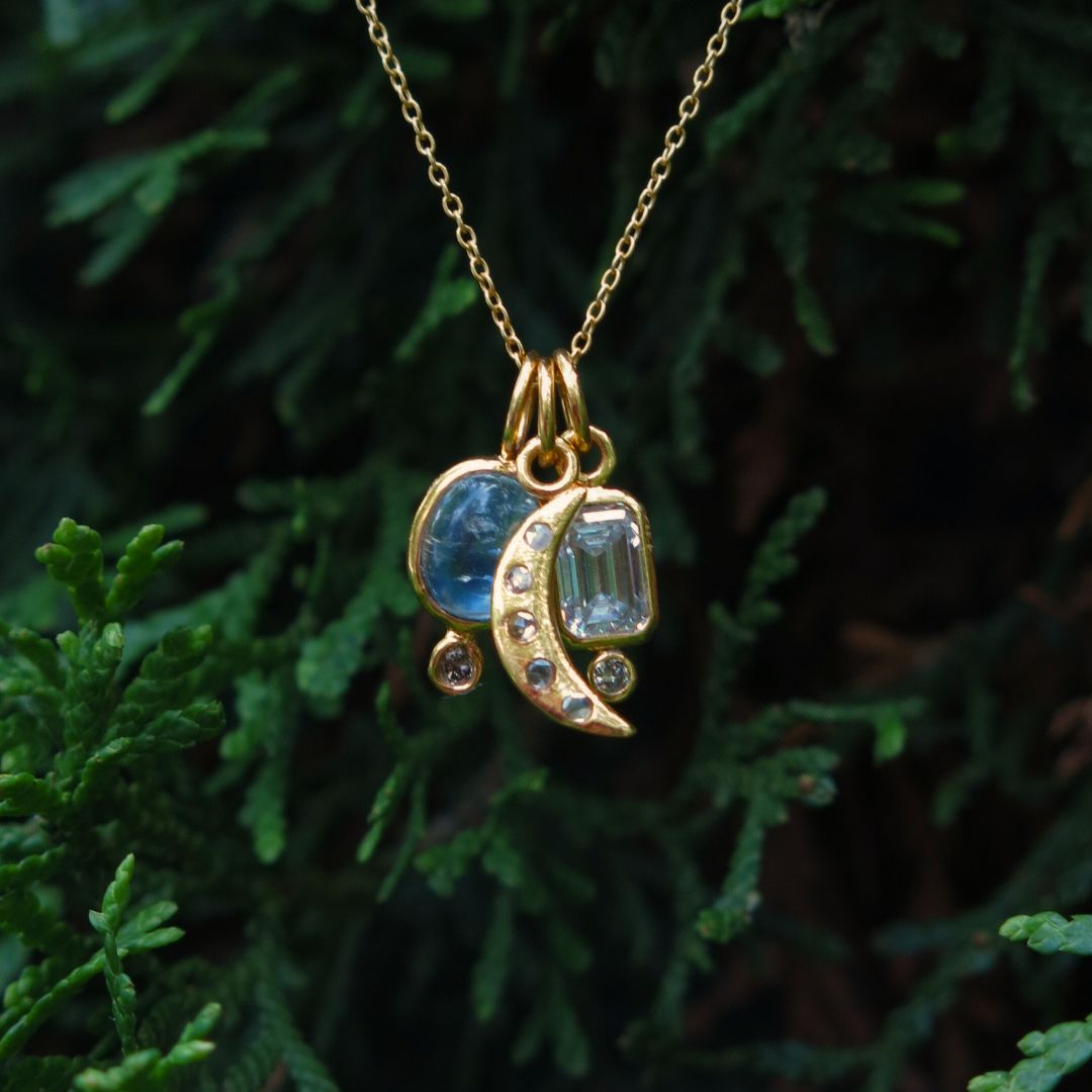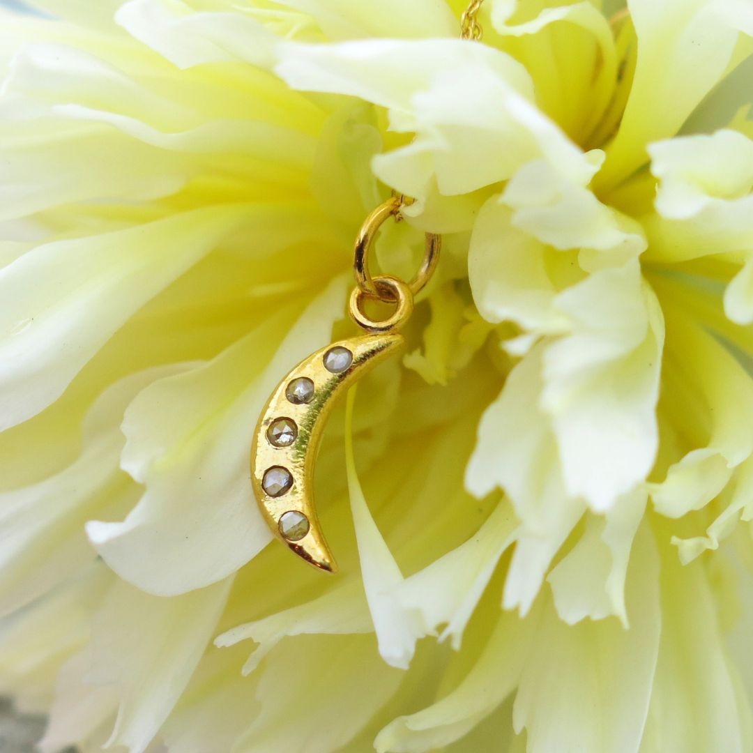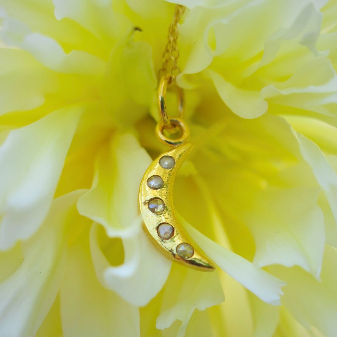 This heirloom-quality pendant is made from 14k gold and set with five shimmering faceted salt and pepper diamonds. Each one unique, like stars scattered across the sky dancing amids the moon in the cosmos. Elegant in scale and rich in detail, it’s a quietly luxurious piece that wears beautifully on its own or layered.