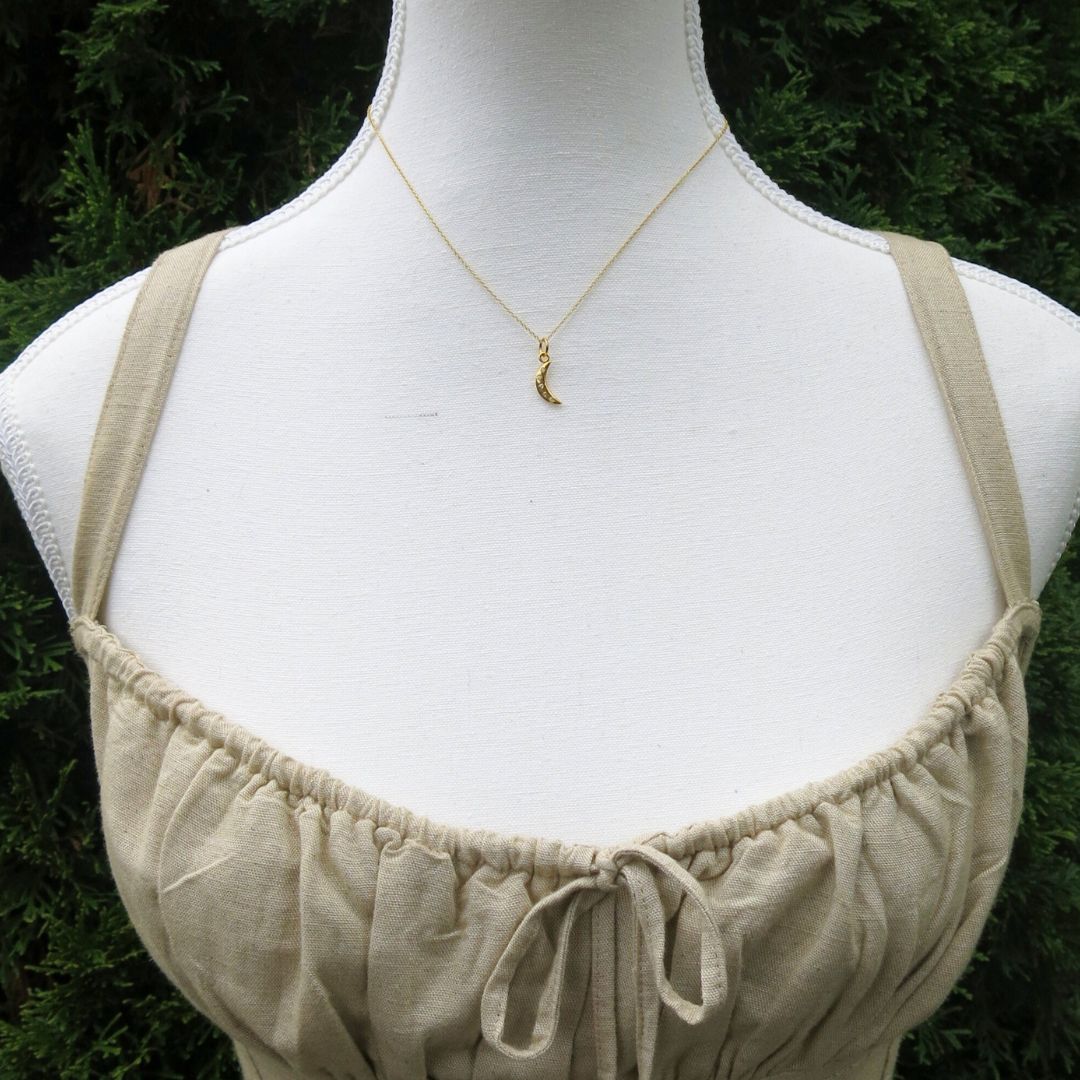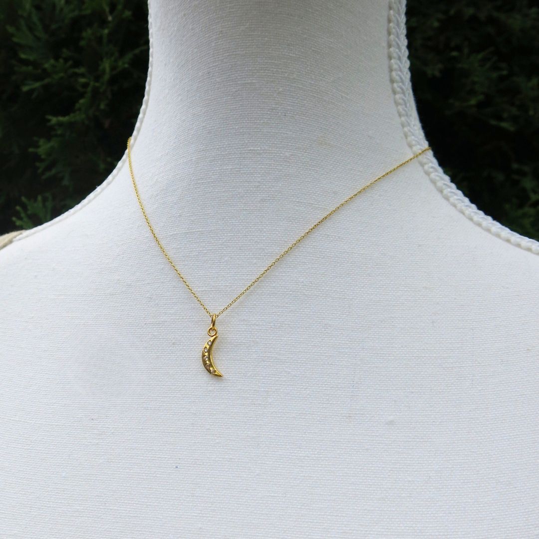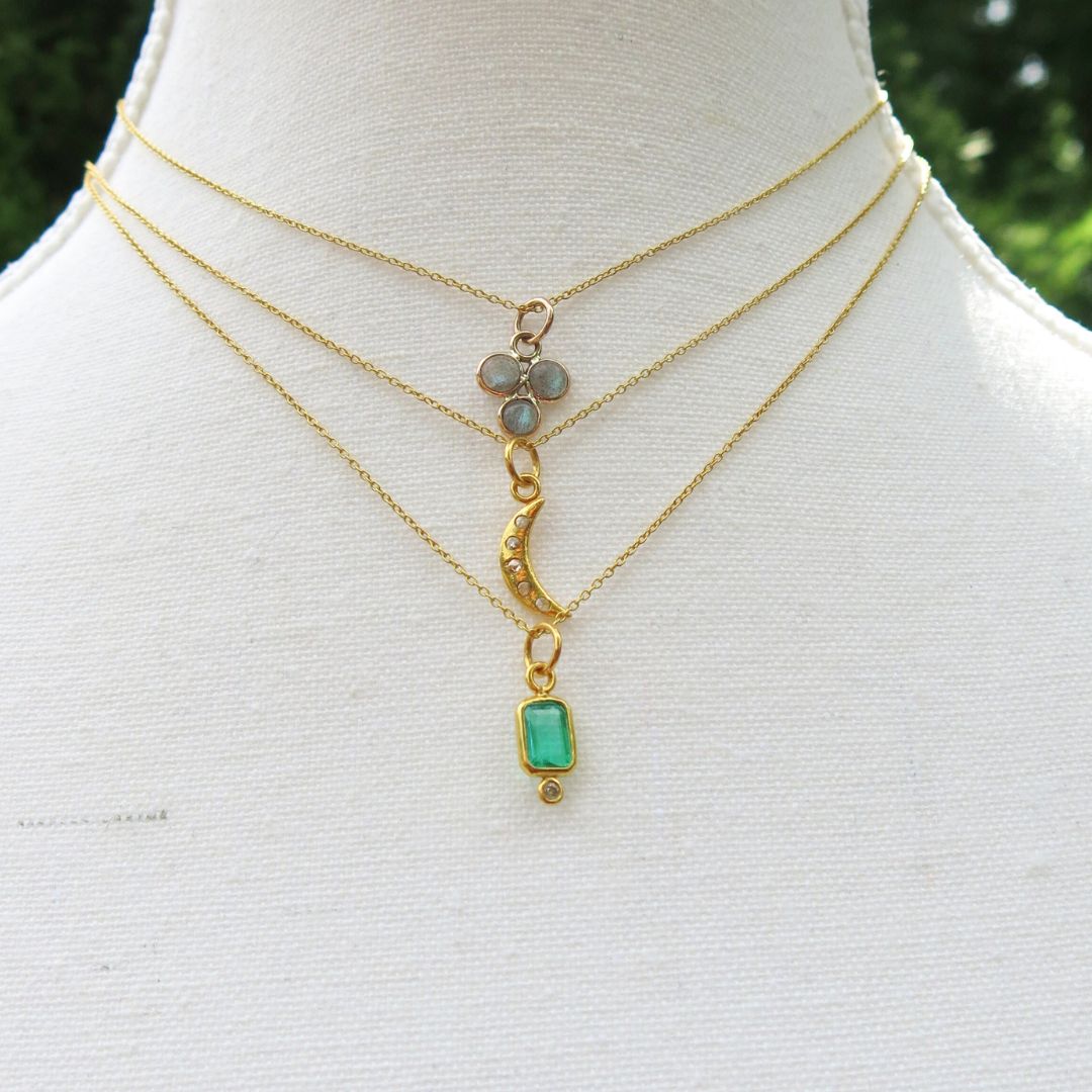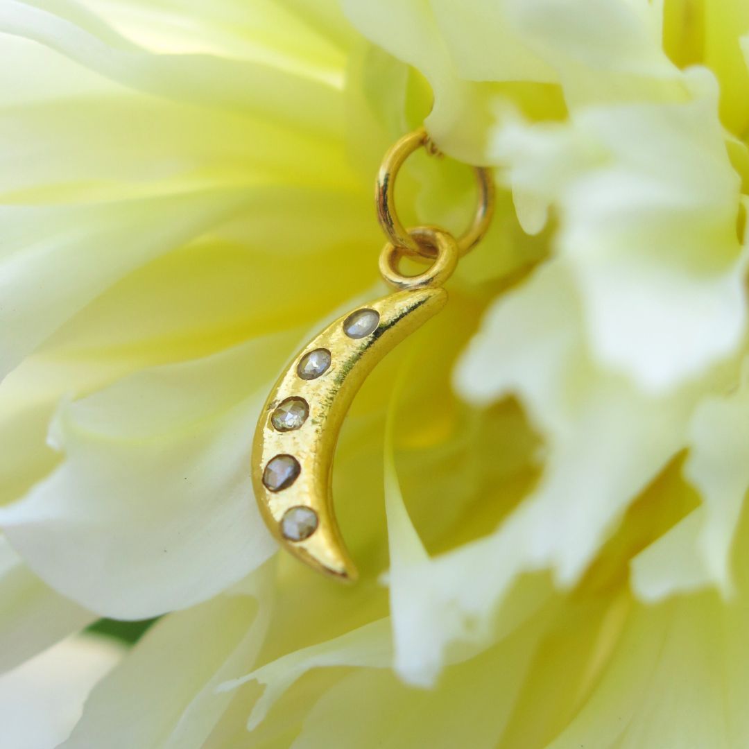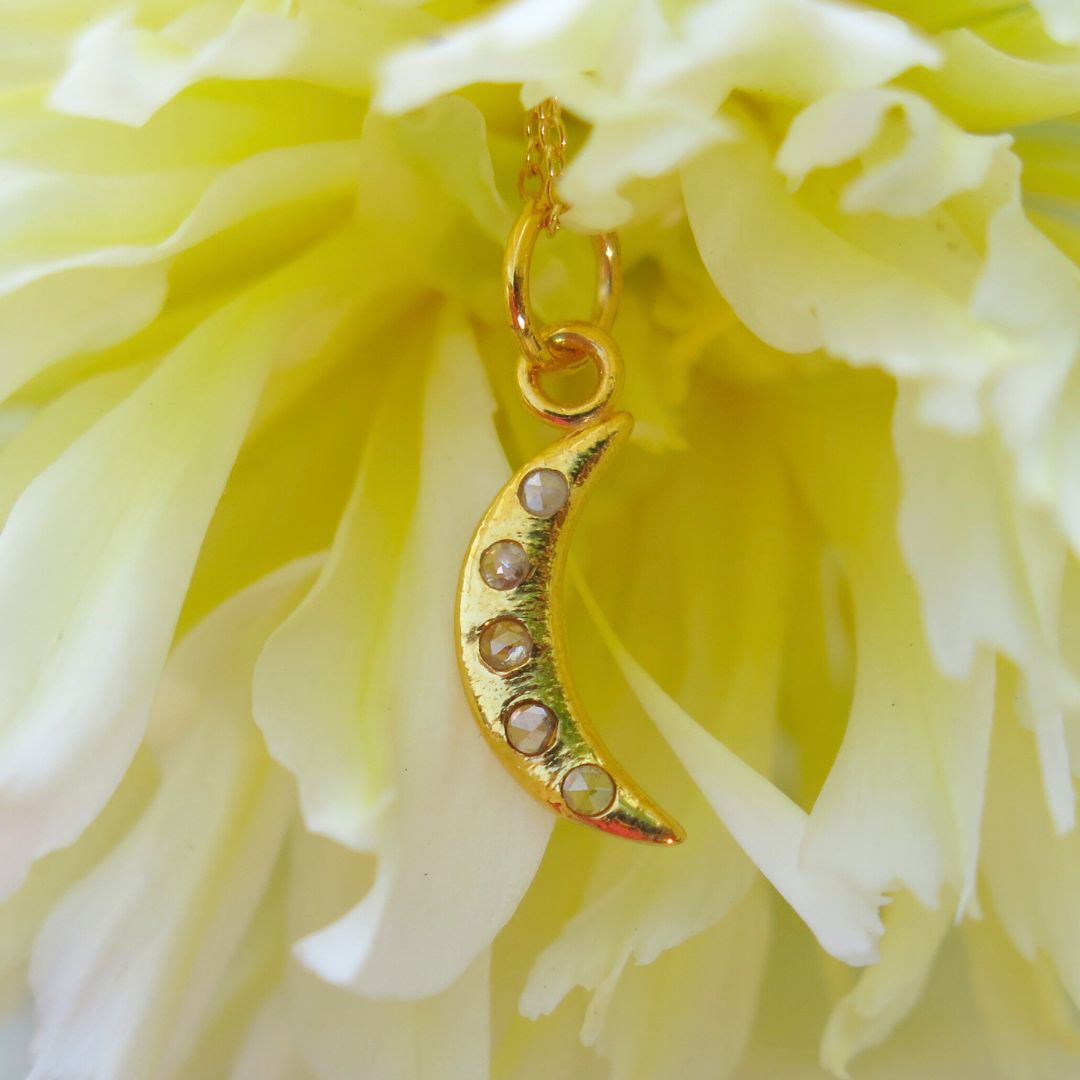 This heirloom-quality pendant is made from 14k gold and set with five shimmering faceted salt and pepper diamonds. Each one unique, like stars scattered across the sky dancing amids the moon in the cosmos. Elegant in scale and rich in detail, it’s a quietly luxurious piece that wears beautifully on its own or layered.